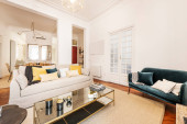 Salon z drewnianym stołem z żeliwną nóżką, białe drewniane krzesła, balkon z czarnym metalowym balustradą i widokiem na dachy miasta