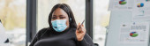 Muzułmańska bizneswoman w masce medycznej stojąca w pobliżu zamazanych kolegów w biurze, transparent