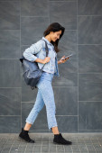 Portret młodej kobiety chodzącej z torbą i telefonem komórkowym na ścianie
