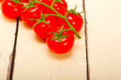 świeże pomidory wiśniowe na klastrze nad wiejskim drewnianym stołem