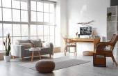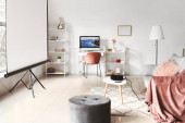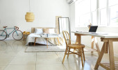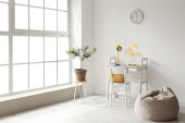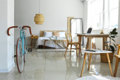 Wnętrze dziecięcej sypialni z nowoczesnym miejscem pracy i rowerem