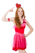 Kobieta wciskając wirtualny przycisk izolowany na białym