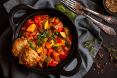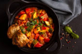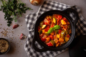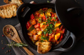 Gotowane różne warzywa z ziołami w czarnym garnku