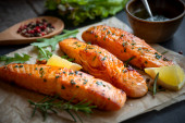 Gotowane ryby łososiowe z sosem śmietankowym w czarnej patelni