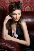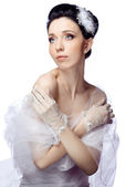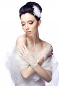Skromna kobieta młody na białym tle na tle białego studia ubrany w cape rękawice z organzy i koronki