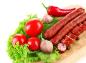 francuski salami, pomidory, chleb i pietruszki na maty wiklinowe na drewniane tła