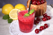 Zbliżenie wiśnia granita w okulary, na tle drewniane kolor