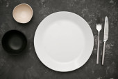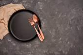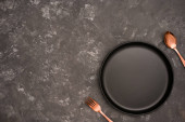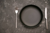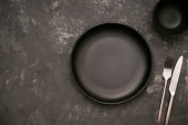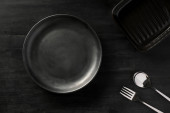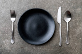 Nad głową, Pusta czarna płyta ceramiczna ze srebrnym widelcem i łyżką na czarnym drewnianym tle stołu.