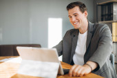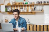 Przystojny facet w żółtych ubraniach siedzi w domu, pije kawę i pracuje na tablecie i telefonie.