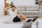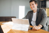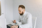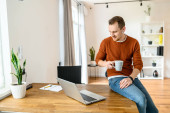 Przystojny facet w żółtych ubraniach siedzi w domu, pije kawę i pracuje na tablecie i telefonie.