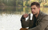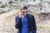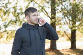 portret atrakcyjny stylowe młody człowiek mówił przez telefon i