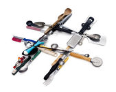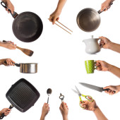 Człowiek posiadający na białym tle naczynia kuchenne