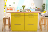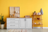 Zdjęcie "Nowoczesne urządzenie regałowe z naczyniami i licznik w pobliżu żółtej ściany w kuchni" może być wykorzystywane do celów osobistych i komercyjnych zgodnie z warunkami zakupionej licencji Royalty-free. Obraz jest dostępny do pobrania w jakości wysokiej rozdzielczości do 5760x3840.