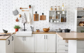 Zdjęcie "Nowoczesne urządzenie regałowe z naczyniami i licznikami w pobliżu ściany świetlnej w kuchni" może być wykorzystywane do celów osobistych i komercyjnych zgodnie z warunkami zakupionej licencji Royalty-free. Obraz jest dostępny do pobrania w jakości wysokiej rozdzielczości do 5760x3840.