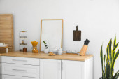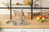 Srebrny zlew i miska z jabłkami na blacie kuchennym