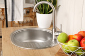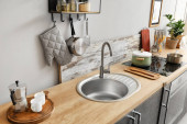 Drewniany blat z umywalką w nowoczesnej kuchni, zbliżenie