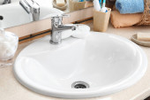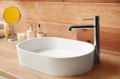 Drewniany blat z umywalką i wazonem przy ścianie z cegły