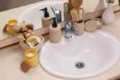 Zdjęcie "Drewniany blat ze srebrnym zlewem, naczyniami, rośliną domową i mydłem do naczyń w pobliżu niebieskiej ściany w kuchni" może być wykorzystywane do celów osobistych i komercyjnych zgodnie z warunkami zakupionej licencji Royalty-free. Obraz jest dostępny do pobrania w jakości wysokiej rozdzielczości do 5760x3840.