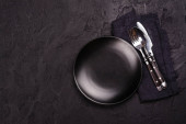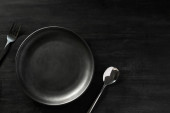 Nad głową, Nowoczesny czarny stół z pustą czarną ceramiczną płytą makietą i srebrem na szarym obrusie.