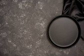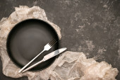 Zdjęcie "Nad głową, Nowoczesny czarny stół z pustą czarną ceramiczną płytą makietą i srebrem na szarym obrusie." może być wykorzystywane do celów osobistych i komercyjnych zgodnie z warunkami zakupionej licencji Royalty-free. Obraz jest dostępny do pobrania w jakości wysokiej rozdzielczości do 5760x3840.
