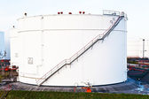 białe zbiorniki na benzynę i olej w gospodarstwie zbiornikowym z niebieskim niebem