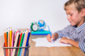 Zdjęcie "mały chłopiec z ołówkami przy stole w klasie" może być wykorzystywane do celów osobistych i komercyjnych zgodnie z warunkami zakupionej licencji Royalty-free. Obraz jest dostępny do pobrania w jakości wysokiej rozdzielczości do 5760x3840.