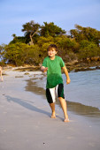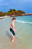 młody chłopak z czerwone włosy w strój kąpielowy jest wzdłuż plaży