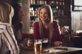 Zdjęcie "Szczęśliwa para siedzi w restauracji. Jedzą kolację z winem i spędzają miło czas razem.." może być wykorzystywane do celów osobistych i komercyjnych zgodnie z warunkami zakupionej licencji Royalty-free. Obraz jest dostępny do pobrania w jakości wysokiej rozdzielczości do 5760x3840.