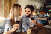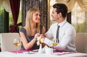 Szczęśliwa para siedzi w restauracji. Jedzą kolację z winem i spędzają miło czas razem..