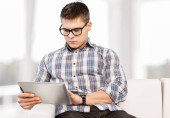 troskliwy człowiek patrząc na cyfrowy tablet siedząc w domu