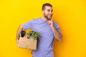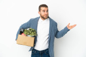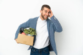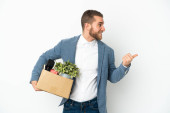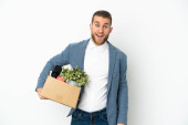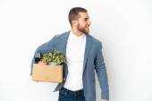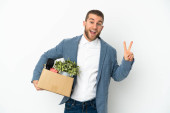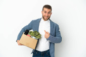 Młody biały robi ruch, podnosząc pudełko pełne rzeczy odizolowanych na białym tle i patrząc w górę