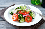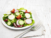 świeży zielony sałatka z sałaty, ogórka, pomidora i czerwona cebula.