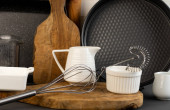 Nowoczesne czarne naczynia na blacie w pobliżu ściany z białej cegły