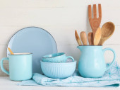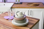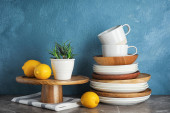 Piękna zastawa stołowa na blacie kuchennym przy ścianie