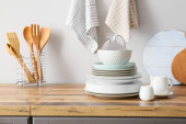 Zdjęcie "Piękna zastawa stołowa na blacie kuchennym przy ścianie" może być wykorzystywane do celów osobistych i komercyjnych zgodnie z warunkami zakupionej licencji Royalty-free. Obraz jest dostępny do pobrania w jakości wysokiej rozdzielczości do 5760x3840.