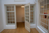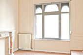 Pusty apartament z dwoma klasycznymi kominkami w perspektywie i przed remontem