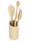 Bambusowe sztućce drewniane, jednorazowy widelec, łyżka, nóż w bambusowej filiżance z naturalnego materiału izolowanego na białym tle. Koncepcja ekologiczna.