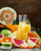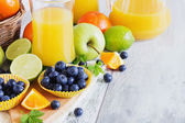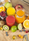 Owoców i warzyw sok i świeże owoce w serwetkę na drewniane tła