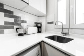 kuchnia z czarnym marmurowym blatem z małym sprzętem i pralką