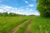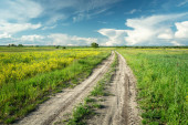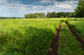 droga gruntowa wśród zielonej prerii pod zachmurzonym niebem