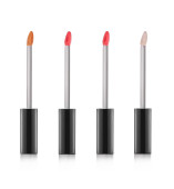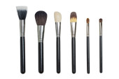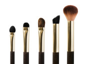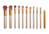 Zestaw profesjonalnych makijaż ukrywacz proszek rumieniec cień oczu brwi szczotki z żółtymi uchwytami izolowane na białym tle
