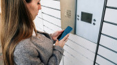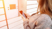 Szafka na przesyłki. Post automat terminalu i ręce z paczki skrzynki kurierskiej. Koncepcja usługi dostarczania zakupów online