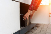 Zdjęcie "Szafka na przesyłki. Post automat terminalu i ręce z paczki skrzynki kurierskiej. Koncepcja usługi dostarczania zakupów online" może być wykorzystywane do celów osobistych i komercyjnych zgodnie z warunkami zakupionej licencji Royalty-free. Obraz jest dostępny do pobrania w jakości wysokiej rozdzielczości do 5760x3840.