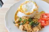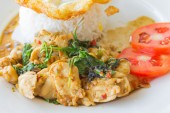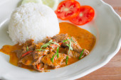 Japoński curry ryż z wieprzowiną na drewnianym tle