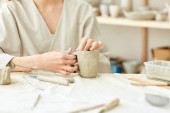 zbliżenie kobieta rzeźbienie ceramiki w jej warsztat