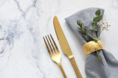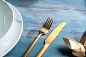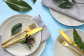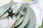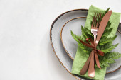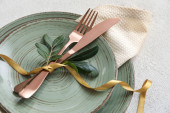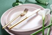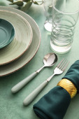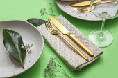 Eleganckie ustawienie stołu na zielonym tle, zbliżenie