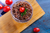 Płyta smacznej owsianki gryczanej z warzywami na szarym stole, zbliżenie