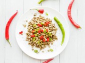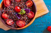 Płyta smacznej owsianki gryczanej z warzywami na drewnianym stole, widok z góry