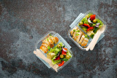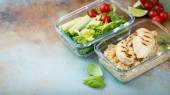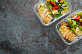 Pudełka na lunch z grillowaną piersią z kurczaka i sałatką z makaronem ze świeżymi warzywami, widok z góry