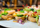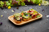 Zestaw bruschetty z łososiem, parmą i sosem pesto. Włoskie przekąski. Różnorodna mieszanka małych kanapek na ciemnym tle. Zdjęcie do menu restauracji